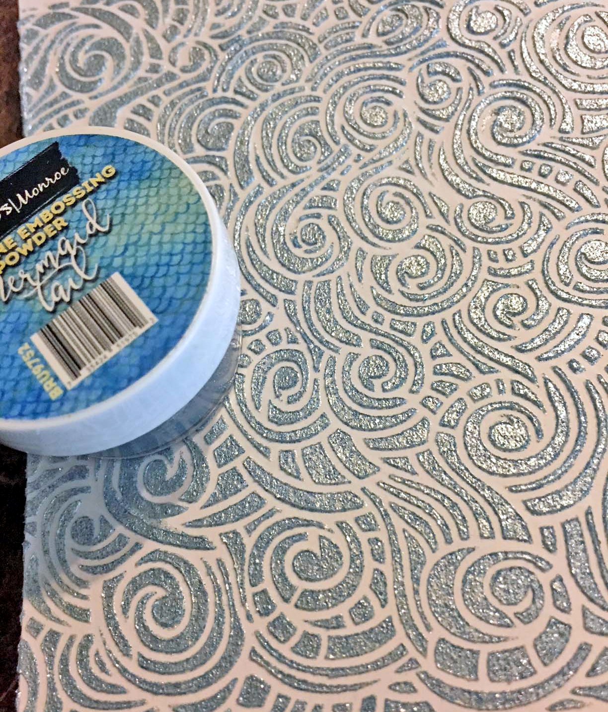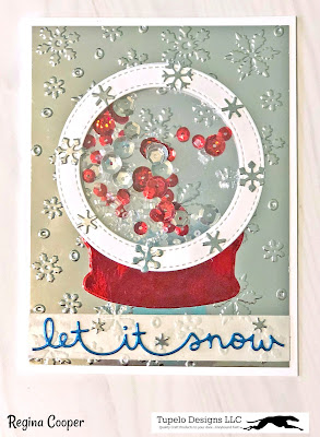 I made a snowglobe shaker card. First, I used the Chrome Silver Mirror Card for the background and embossed it with a snowflake embossing folder I had in my stash. This cardstock embosses so beautifully!